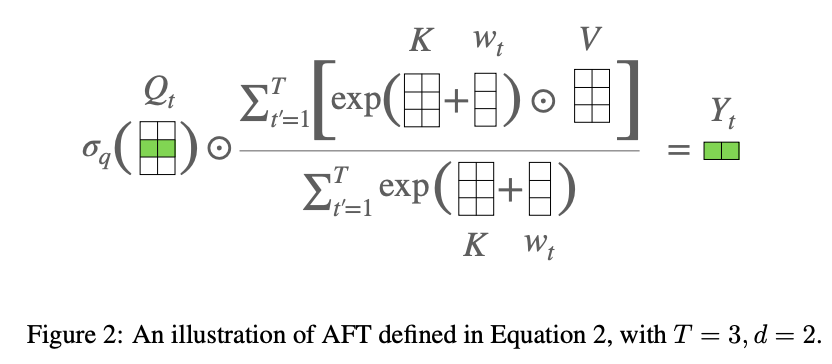 但不同的是,AFT中的K和V首先與一組學習得到的位置偏差(position bias)結合,然后再進行同位元素對應相乘(element-wise multiplication)。