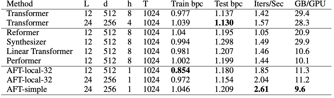 而結果是,AFT僅僅消耗了1/3的內存,就提供了提供了44%的速度提升,且在bpc上與完整的Transformer的距離只相差0.024,在參數、速度、內存和性能方面均取得了最佳平衡。