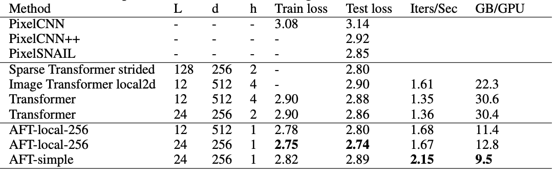 與Lambda網絡相比,所有的AFT變體都達到了相當或更好的精度,且速度相當,內存占用更小。