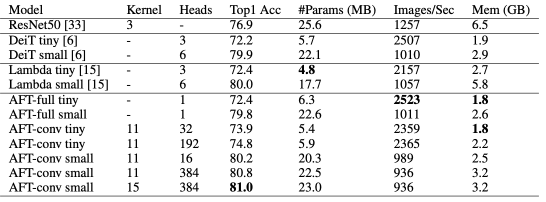 而在參數數量相似或更少的情況下,AFT-conv的準確率更高。