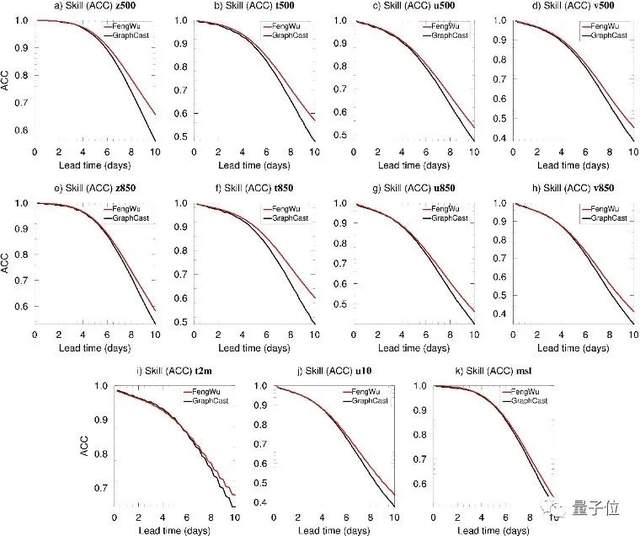 下圖對不同大氣變量的預測結果。ACC是用于衡量預測結果有效性的指標,數值越高,預測結果越有效(紅線代表“風烏”,黑線代表GraphCast)。
