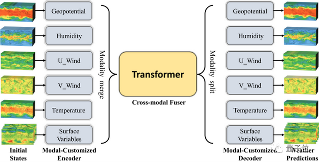 “風烏”采用多模態神經網絡和多任務自動均衡權重解決多種大氣變量表征和相互影響的問題。其針對的大氣變量包括:位勢、濕度、緯向風速、經向風速、溫度以及地表等。“風烏”將這些大氣變量看作多模態信息,使用多模態網絡結構可以更好地處理這些信息。
