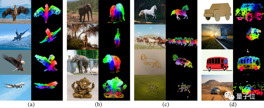 而且從PCA(主成分分析)圖像效果來看,DINOv2不僅能準確分類,還能用不同顏色標出它們“相同”的部分,例如象鼻都是綠色、車輪都是紅色、馬的尾巴是黃色等。