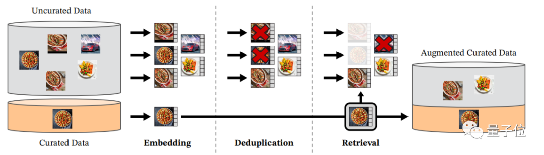 具體來說,DINOv2構建了一個數據篩選pipeline,將內容相似的圖片精心篩選出來,同時排除掉相同的圖片: