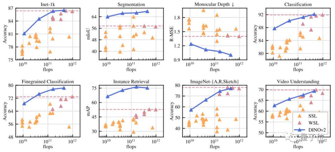 這是DINOv2在8個視覺任務上的表現,包括語義分割、分類、深度估計等,其中橙色是自監督方法的效果,深粉色是弱監督方法的效果。