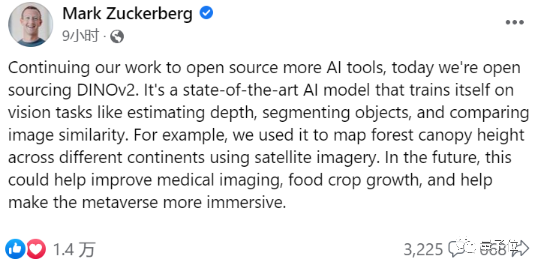 除此之外,如同扎克伯格所說,DINOv2還能被用于改善醫學成像、糧食作物生長等。當然這里小扎還進一步強調: