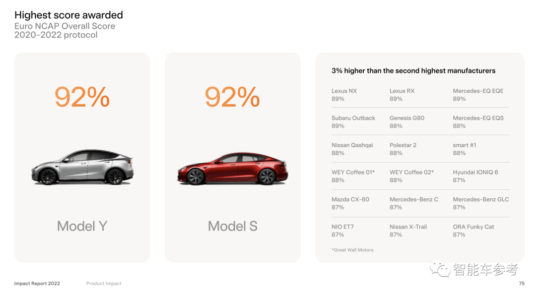 具體到歐盟新車安全評鑒協會給出的評分,2020-2022年期間,特斯拉Model Y評分為92%,Model S評分也為92%,“比第二名都高出3%”。
