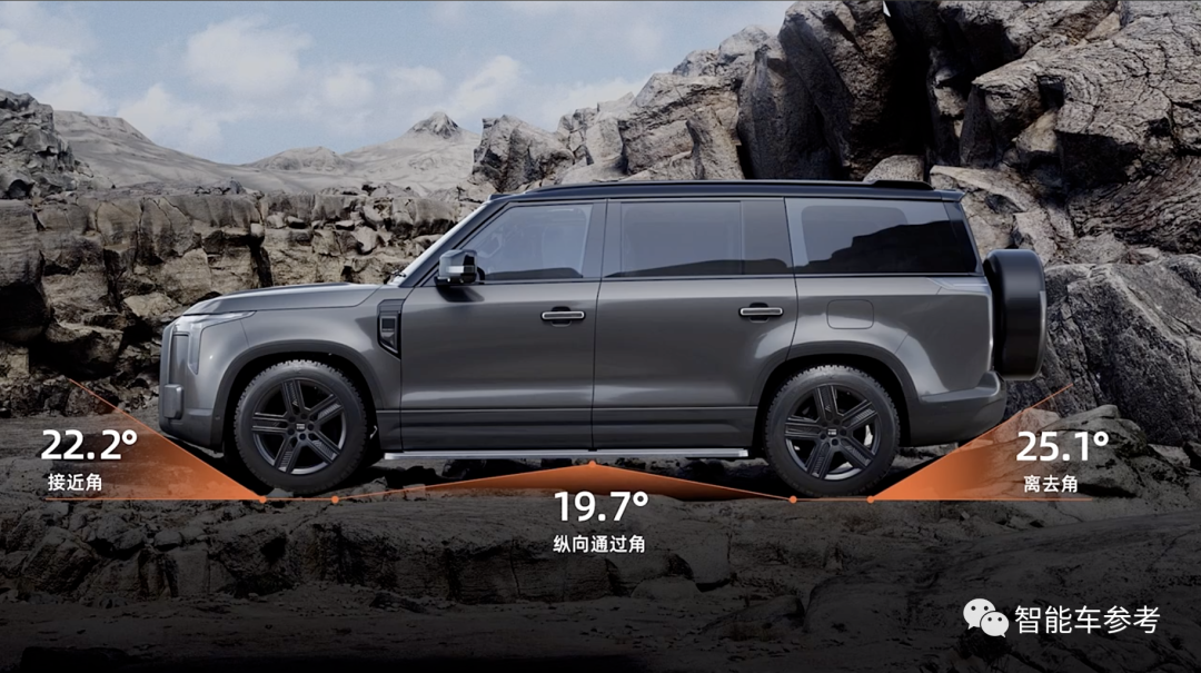 并且,極石01接近角22.2度,離去角25.1度,縱向通過角19.7度,底盤最小離地間隙205mm,可爬45度坡,通過60cm深度的交叉軸,還有70cm的涉水深度。