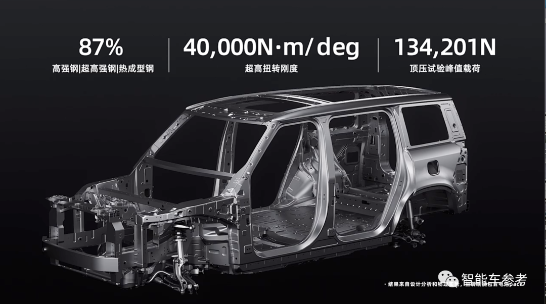 車身結(jié)構(gòu)方面,極石01車身骨架高強(qiáng)鋼、超高強(qiáng)鋼和熱成型鋼占比達(dá)到87%,扭轉(zhuǎn)剛度為40000N·m,頂壓試驗(yàn)峰值載荷134201N。