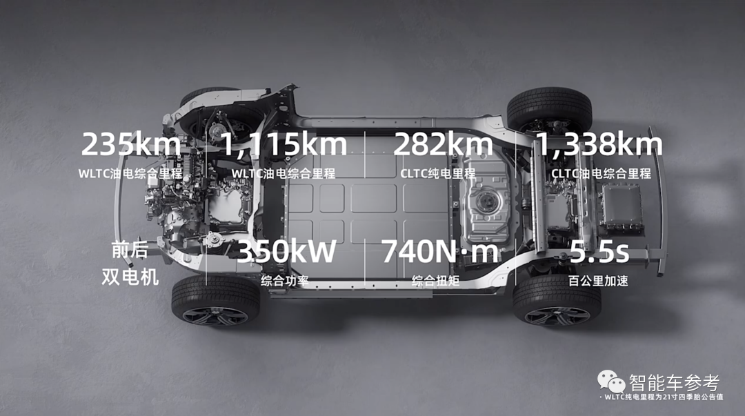 并且采用雙電機(jī)四驅(qū)的模式,前后雙電機(jī)綜合功率350kW,綜合扭矩740N·m,百公里加速為5.5s。