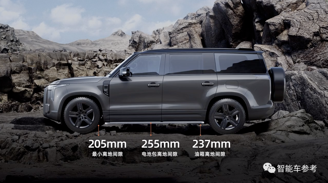 保證通過時(shí)的安全性方面,極石01的電池包和油箱離地間隙分別為255mm和237mm。