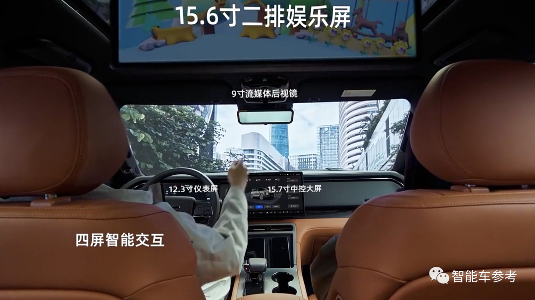 芯片是高通8155,車內(nèi)屏幕包括12.3英寸儀表、15.7英寸3k中控大屏,9英寸流媒體后視鏡,以及15.6英寸二排娛樂屏,支持屏幕間的互聯(lián)互通,二排娛樂屏還可唱k、投屏打游戲。
