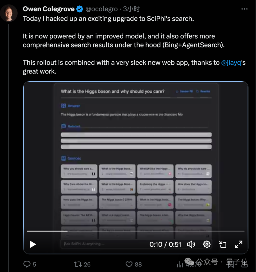 目前,已有偏學術的開源AI搜索引擎SciPhi使用賈揚清的代碼完成升級。