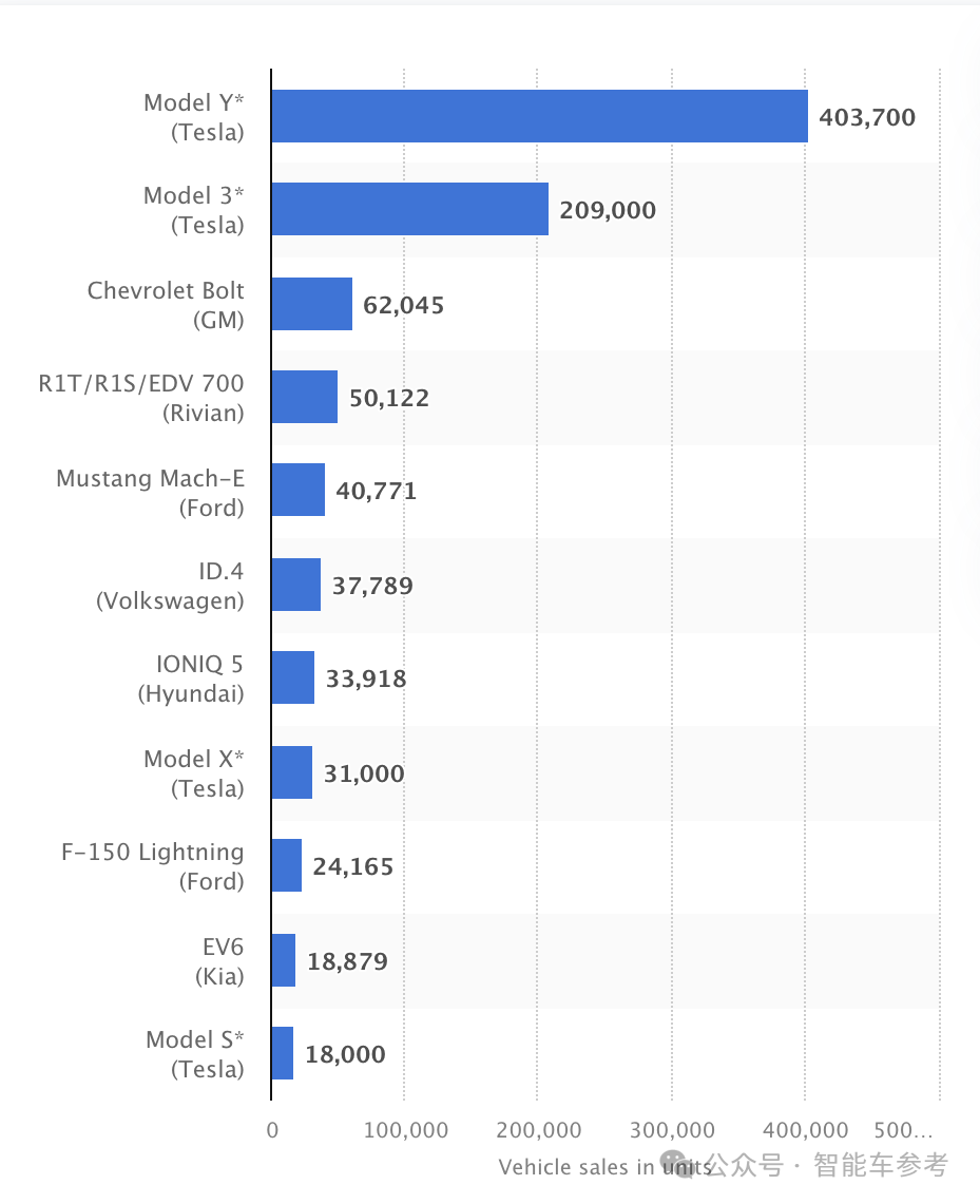 并且在2023年美國最暢銷純電車排行榜中,一款寶馬的車都沒有,而都是特斯拉、雪佛蘭、Rivian這些滿足寶馬“百億補貼”條件的產品。(來源:Statista)