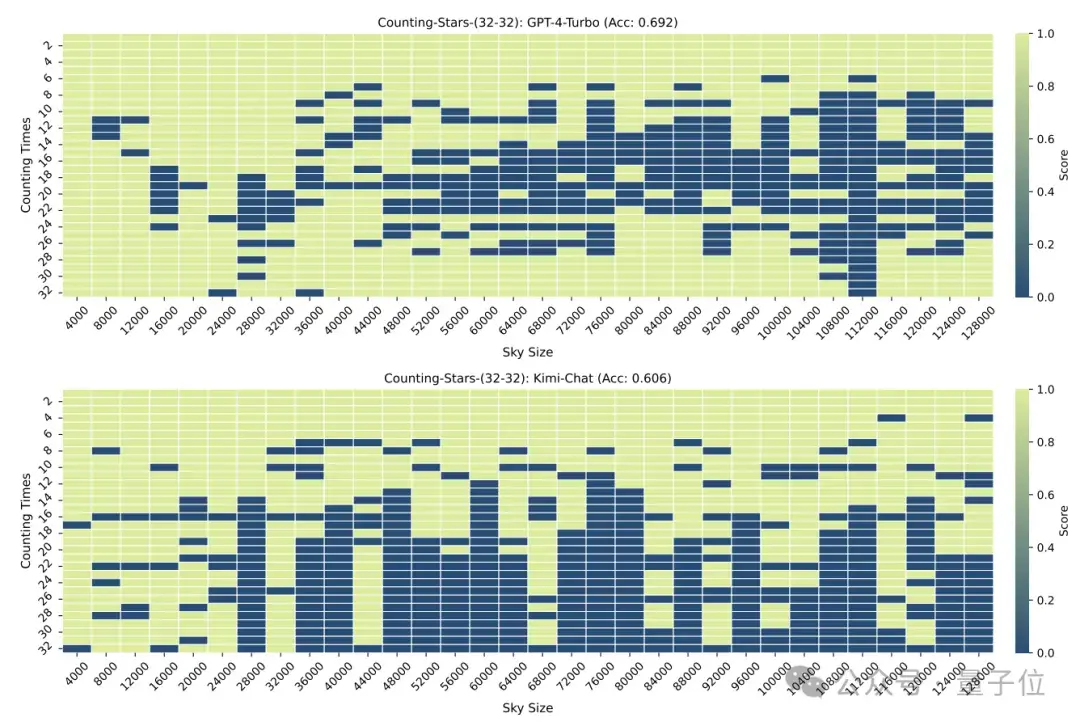 而劃分的顆粒度也會(huì)對(duì)模型的表現(xiàn)造成一些影響,在“星星”同樣出現(xiàn)32次時(shí),顆粒度從32變?yōu)?6,GPT-4的成績(jī)有所上升,而Kimi則有所下降。