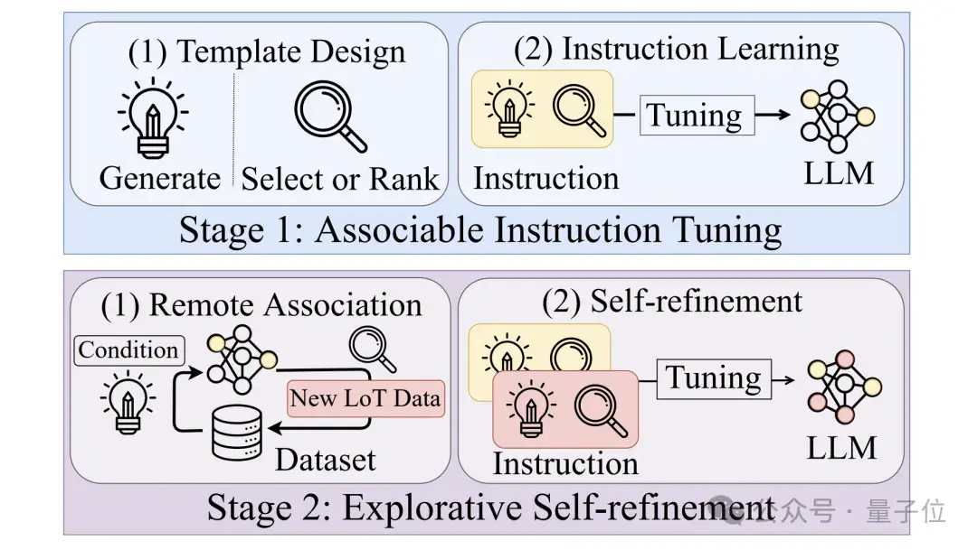 在這一階段中,本文首先通過設計遠關聯的條件詞,促使(1)中的模型生成多樣化且與輸入遠關聯的回答,并設計篩選流程,獲得可靠的新LoT數據。隨后,新數據被轉換成指令微調的訓練數據,用于進一步微調模型。
