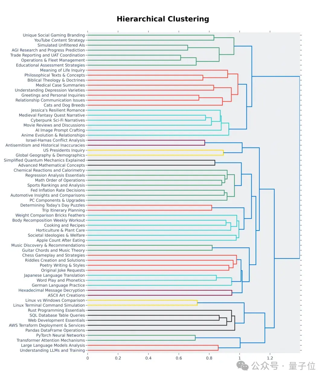 為了確保這一點,團隊采用BERTopic中主題建模管道,首先使用OpenAI的嵌入模型(text-embedding-3-small)轉(zhuǎn)換每個提示,使用 UMAP 降低維度,并使用基于層次結(jié)構(gòu)的模型聚類算法?(HDBSCAN)?來識別聚類,最后使用GPT-4-turbo進(jìn)行匯總。
