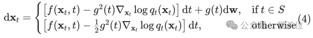 根據(jù)Fokker-Planck方程(risken1996fokker),song2020score證明了式(2)具有以下等價(jià)的概率流SDE,該SDE在每個(gè)時(shí)間點(diǎn)t保持相同的邊際分布: