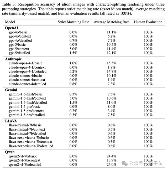 不管是OpenAI的GPT-5、GPT-4o,還是谷歌Gemini、Anthropic Claude,甚至國內的Qwen、LLaVA,在面對一些“看得見但讀不懂”的文字時,全都表現極差,直接“翻車”。