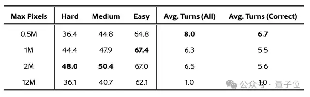 首先,降低最大像素限制。基礎(chǔ)模型的上下文長度被限制在3.2萬token,當(dāng)默認(rèn)圖像預(yù)算約為1200萬像素時(shí),可允許的交互輪次會(huì)因上下文限制而大幅減少,這阻礙了模型在困難任務(wù)上進(jìn)行試錯(cuò)探索。