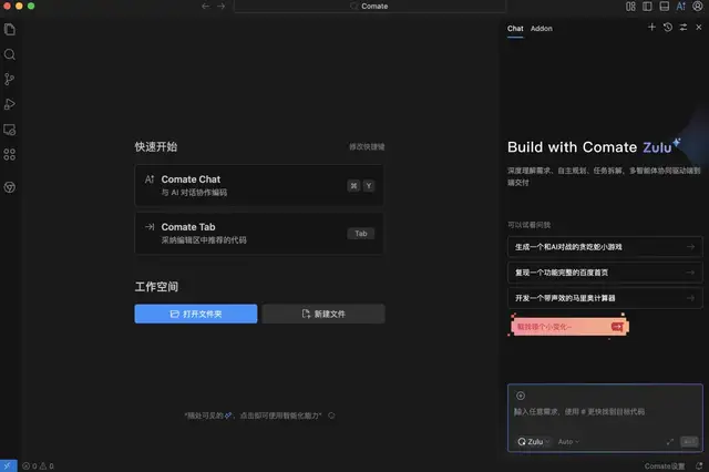 文心快碼以百度自研文心代碼大模型為核心引擎,最新版本3.5S(Super Synergistic AgentS)增強(qiáng)多智能體協(xié)同能力。編程智能體Zulu支持通過自然語言端到端完成編程任務(wù)以及定制專屬智能體。可在主流IDE中安裝Comate插件,并提供代碼補(bǔ)全、行內(nèi)對(duì)話等輔助功能。