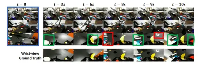 - 多數模型僅模擬單一第三人稱視角,導致“部分可觀測性問題”——例如機械臂抓取物體時,模型看不到腕部與物體的接觸狀態,可能出現“物體無物理接觸卻瞬移到夾爪中”的幻覺;
