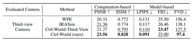 在10秒長軌跡生成測試中(256個隨機剪輯,15步/秒動作輸入),CTRL-WORLD在核心指標上全面領先基線模型(WPE、IRASim):