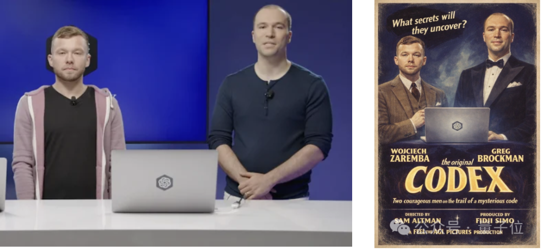 根據(jù)這兩位男士的圖片,制作一張名為《Codex》的好萊塢黃金時(shí)代電影海報(bào)。演員姓名改為Wojciech Zaremba(左)和Greg Brockman(右),由奧特曼執(zhí)導(dǎo),菲吉·西莫制片,AGI影業(yè)出品。