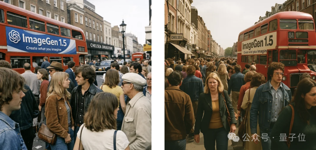 拍攝一張20世紀(jì)70年代倫敦切爾西的場景照片,畫面要逼真,所有景物清晰對(duì)焦,人群密集,還有一輛公交車,車身貼著「ImageGen 1.5」的廣告,廣告上印有OpenAI標(biāo)志和「創(chuàng)造你的想象」的副標(biāo)題。整體風(fēng)格像業(yè)余攝影作品,iPhone快照畫質(zhì)……