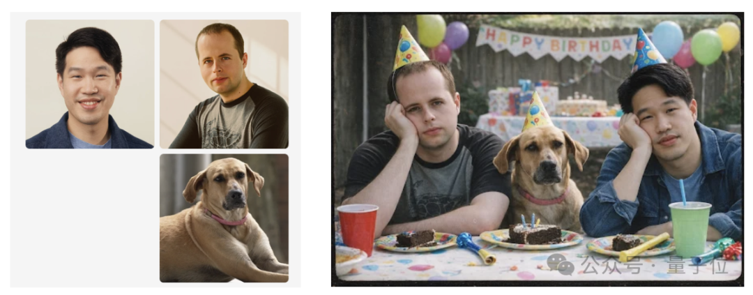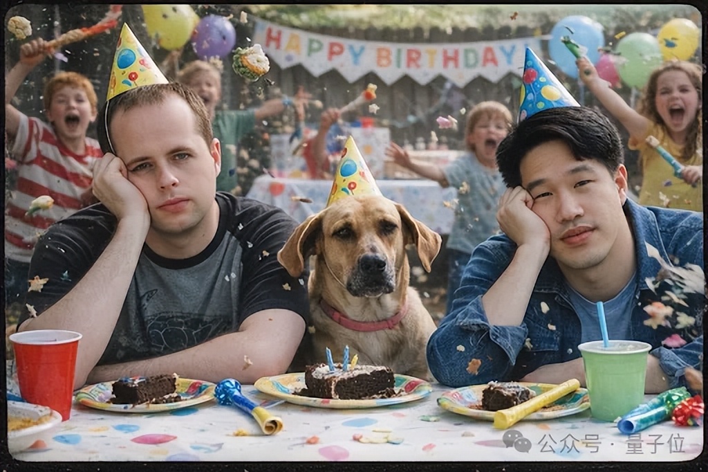 例如:生成一張2000年代膠片相機(jī)風(fēng)格的照片,畫面中兩名男子和一條狗出現(xiàn)在孩子的生日派對(duì)上,神情略顯無聊。